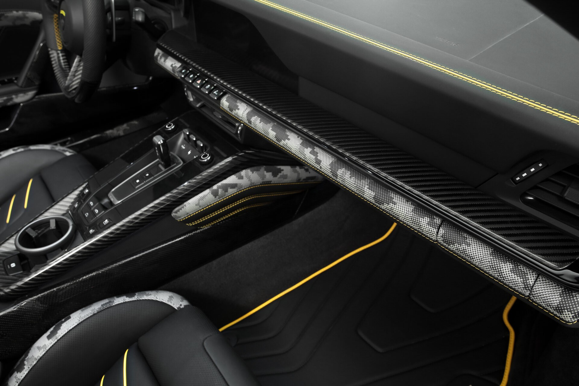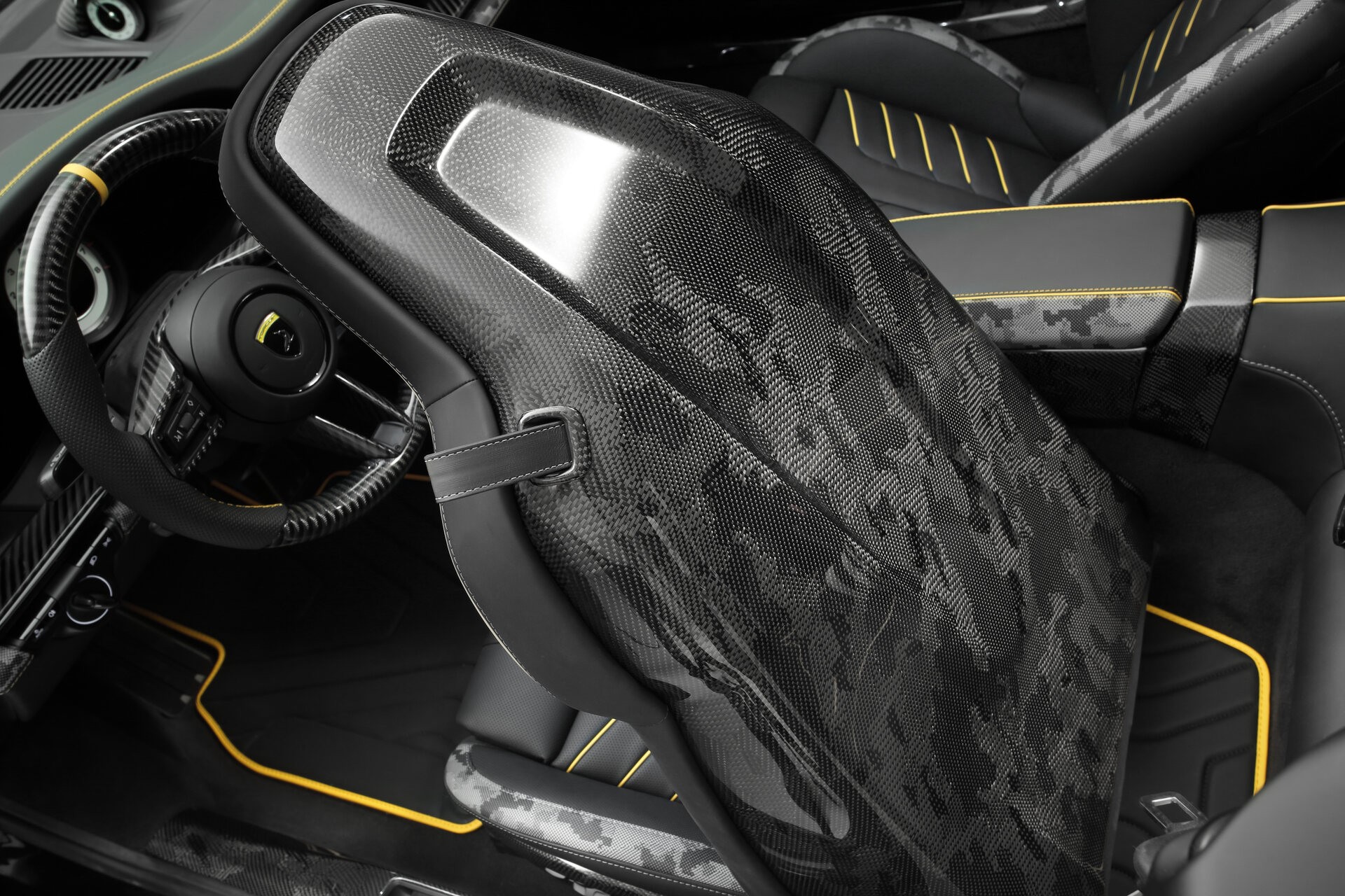 Этот автомобиль имеет третий серийный номер. Классический цвет углеродного волокна, легкие кованые диски TopCar Design и титановая выхлопная система Akrapovic — это далеко не все улучшения для этого автомобиля. Изменения коснулись и салона: мы полностью переработали салон с использованием карбона и желтых акцентных линий, а также впервые применили камуфляжный карбон в деталях отделки салона.