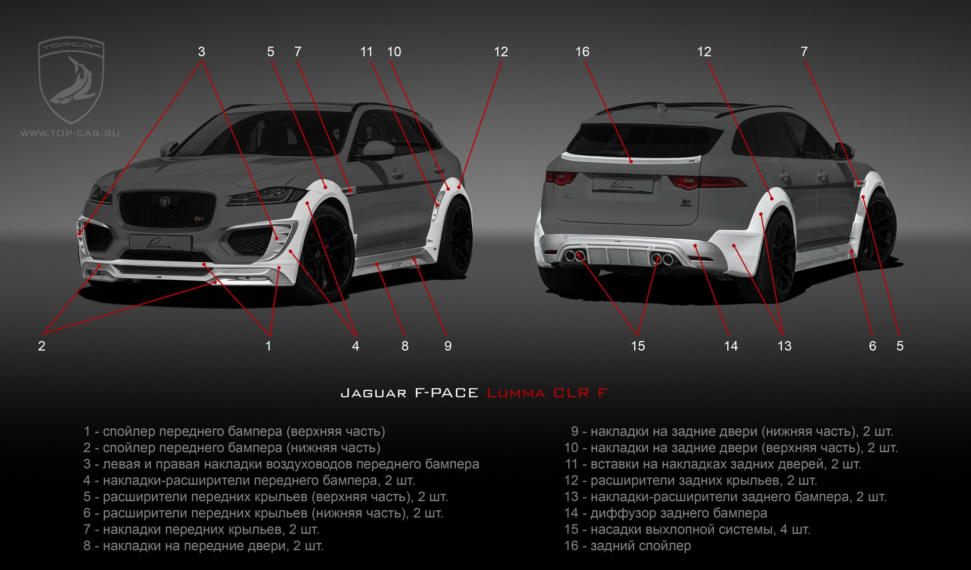 | 16 - Задний спойлер (на 5-ю дверь, подходят для всех версий Jaguar F-PACE) | 456.00 € | ||