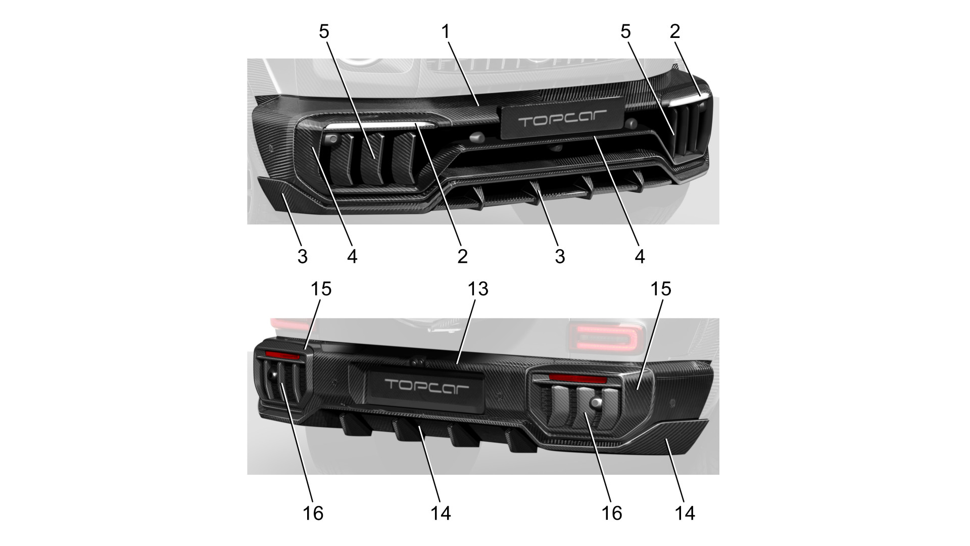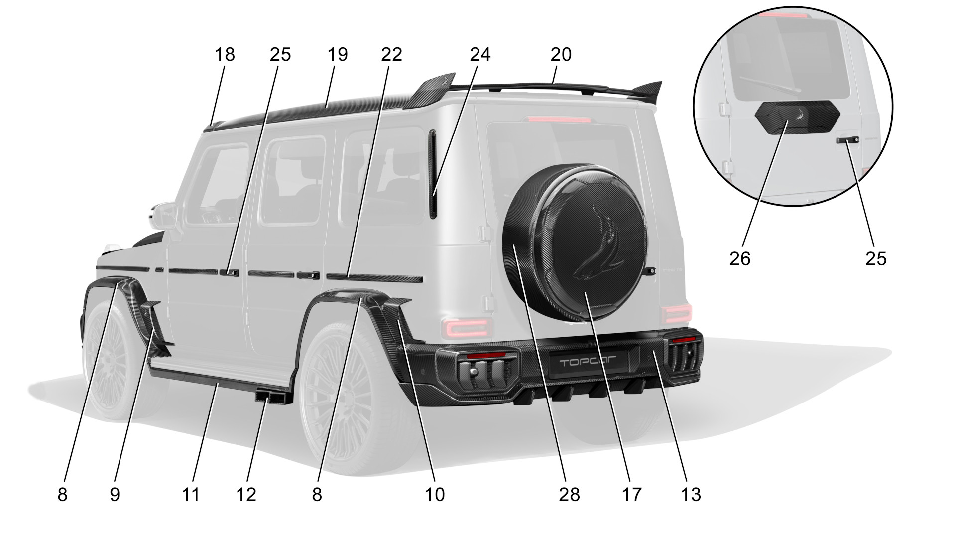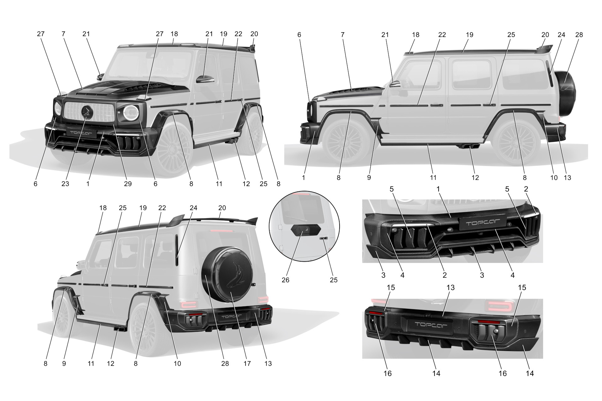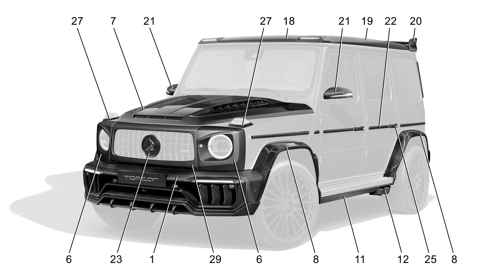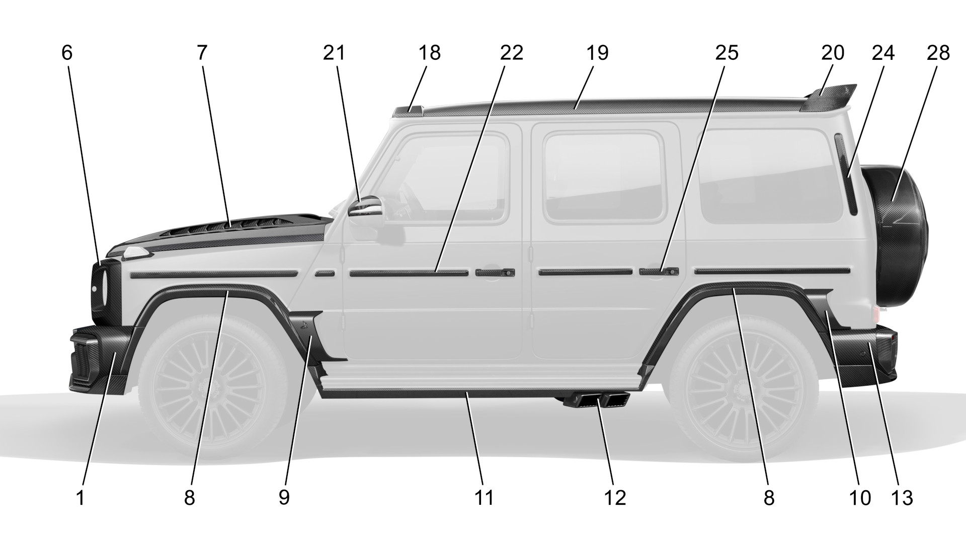 INFERNO - Базовый комплект карбон 1. Передний бампер с карбоновыми воздуховодами и номерной планкой, под покраску 380 000.00 руб. 2. LED огни, 2шт. 100 000.00 руб. 3. Губа переднего бампера, лицевой карбон 280 000.00 руб. 4. Центральный спойлер переднего бампера с каркасом и вставками под LED-огни, лицевой карбон 430 000.00 руб. 5. Решетки переднего бампера, 6 дет., лицевой карбон 140 000.00 руб. 8. Расширители крыльев, 8 дет., комбинированные 500 000.00 руб. 9. Накладки на передние крылья с лого, 2 шт., лицевой карбон 115 000.00 руб. 11. Боковые пороги, 6 дет., лицевой карбон 400 000.00 руб. 13. Задний бампер, под покраску 310 000.00 руб. 14. Диффузор заднего бмпера, лицевой карбон 290 000.00 руб. 15. Вставки в задний бампер, 2 шт., лицевой карбон 240 000.00 руб. 16. Решетки заднего бампера, 6 дет., лицевой карбон 140 000.00 руб. ИТОГО: 3 325 000.00 руб. Покраска и установка: 650 000.00 руб. INFERNO - Полный комплект карбон Передний бампер с карбоновыми воздуховодами и номерной планкой, лицевой карбон 570 000.00 руб. 2. LED огни, 2шт. 100 000.00 руб. 3. Губа переднего бампера, лицевой карбон 280 000.00 руб. 4. Центральный спойлер переднего бампера с каркасом и вставками под LED-огни, лицевой карбон 430 000.00 руб. 5. Решетки переднего бампера, 6 дет., лицевой карбон 140 000.00 руб. 6.1. Накладки на фары, 2 шт. 154 000.00 руб. 6.2. Накладки на фары Angry style, 2 шт., лицевой карбон 154 000.00 руб. 8. Расширители крыльев, 8 дет., лицевой карбон 750 000.00 руб. 9. Накладки на передние крылья с лого, 2 шт., лицевой карбон 115 000.00 руб. 10. Накладки на задние крылья, 2 шт., лицевой карбон 110 000.00 руб. 11. Боковые пороги, 6 дет., лицевой карбон 400 000.00 руб. 12.1. Насадки выхлопной системы, 4 шт. 180 000.00 руб. 13. Задний бампер, лицевой карбон 465 000.00 руб. 14. Диффузор заднего бампера, лицевой карбон 290 000.00 руб. 15. Вставки в задний бампер, 2 шт., лицевой карбон 240 000.00 руб. 16. Решетки заднего бампера., 6 дет., лицевой карбон 140 000.00 руб. 17.1. Крышка запаски Shark style 200 000.00 руб. 17.2. Крышка запаски Mercedes, лицевой карбон 200 000.00 руб. 18. Накладка на крышу с LED, лицевой карбон 250 000.00 руб. 19. Боковые накладки на крышу, 2шт., лицевой карбон 120 000.00 руб. 20.3. Спойлер на крышу Aero style, лицевой карбон 280 000.00 руб. 21. Накладки на зеркала, 2 шт., лицевой карбон 100 000.00 руб. 22. Боковые молдинги, 10 шт., лицевой карбон 250 000.00 руб. 23. Эмблема акула 50 000.00 руб. 24. Воздуховоды задних стоек, 2 шт., лицевой карбон 50 000.00 руб. 25. Дверные ручки, 5 шт., лицевой карбон 250 000.00 руб. 27. Рамки поворотников на передних крыльях, 2 шт., лицевой карбон 50 000.00 руб. 28. Обод кофра запасного колеса, лицевой карбон 250 000.00 руб. ИТОГО: 6 214 000.00 руб. Покраска и установка: 750 000.00 руб. Опции 3. Губа переднего бампера, под покраску 220 000.00 руб. 4. Центральный спойлер переднего бампера с каркасом и вставками под LED-огни, под покраску 370 000.00 руб. 5. Решетки переднего бампера, 6 дет., под покраску 100 000.00 руб. 6.1. Накладки на фары, 2 шт. / 6.2. Накладки на фары Angry style, 2шт., комбинированные 110 000.00 руб. 7.1. Капот, лицевой карбон 750 000.00 руб. 7.1. Капот, под покраску 635 000.00 руб. 7.2. Капот Aero style, лицевой карбон 850 000.00 руб. 7.2. Капот Aero style, под покраску 720 000.00 руб. 8. Расширители крыльев, 8 дет., комбинированные 500 000.00 руб. 9. Накладки на передние крылья с лого, 2 шт., под покраску 85 000.00 руб. 10. Накладки на задние крылья, 2 шт., под покраску 80 000.00 руб. 11. Боковые пороги, 6 дет., под покраску 250 000.00 руб. 12.2. Насадки выхлопной системы V2, временно недоступно 13. Задний бампер, под покраску 310 000.00 руб. 14. Диффузор заднего бампера, под покраску 250 000.00 руб. 15. Вставки в задний бампер, 2 шт., под покраску 200 000.00 руб. 16. Решетки зад