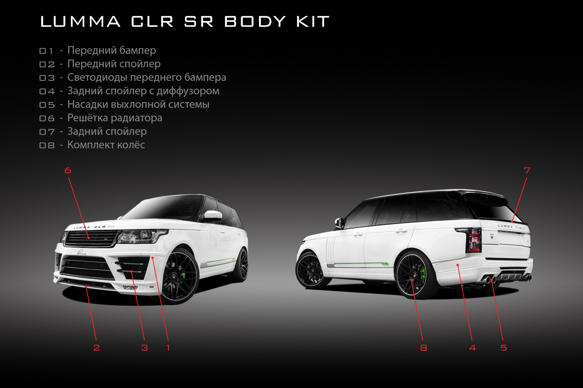 | Обвес LUMMA CLR SR включая: 01.Передний бампер с дневными ходовыми огнями в 4 шт. 02.Передний спойлер снизу 04.Задний бампер с задним диффузором 05.Насадки на глушитель из нержавеющей стали, 4x100mm с лого LUMMA - Надписи SR LUMMA CLR 2 шт. цвет черный - Крепеж - Инструкция по установке. 03.Оригинальные противотуманные фары (остаются) | 12 900.00 € | ||