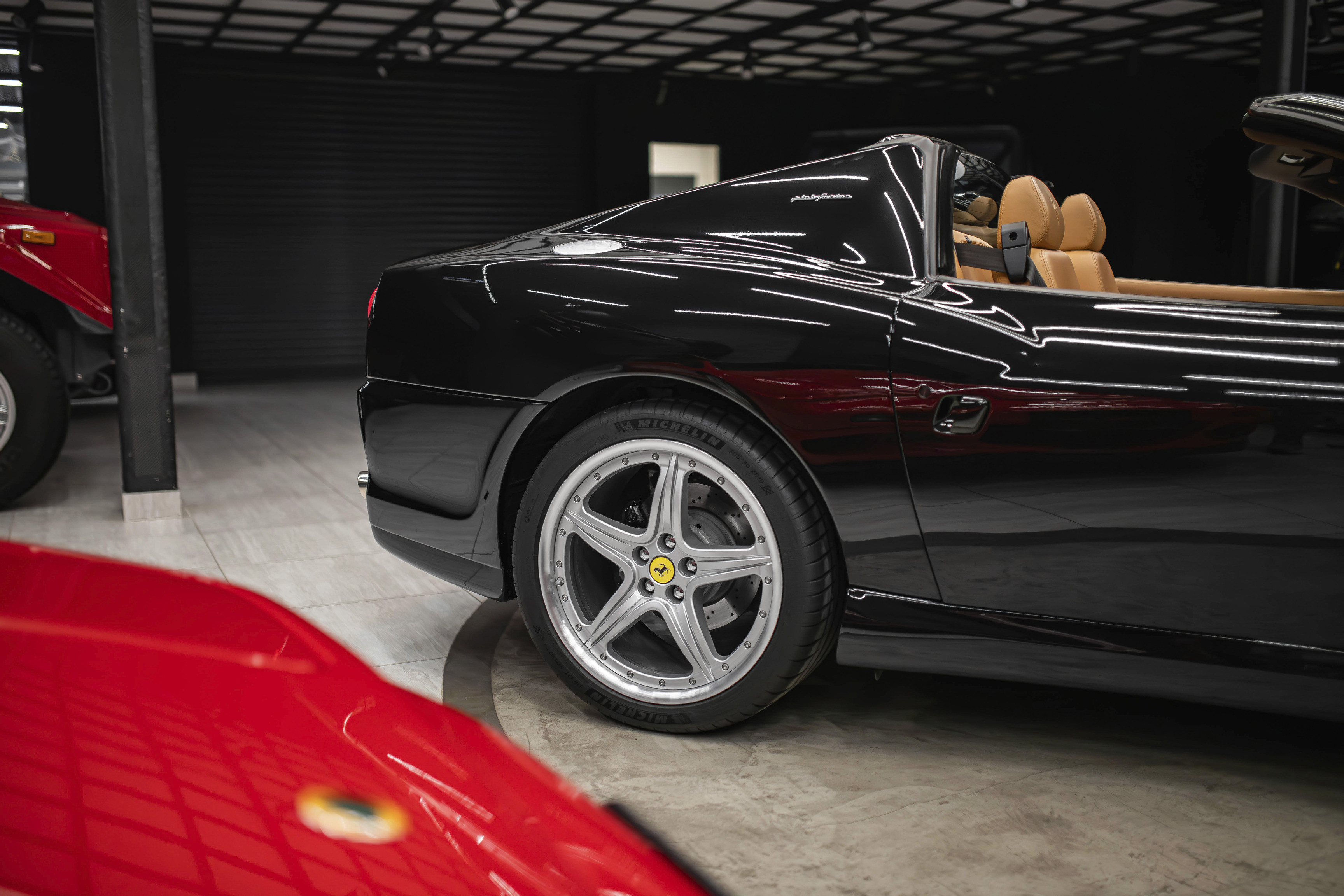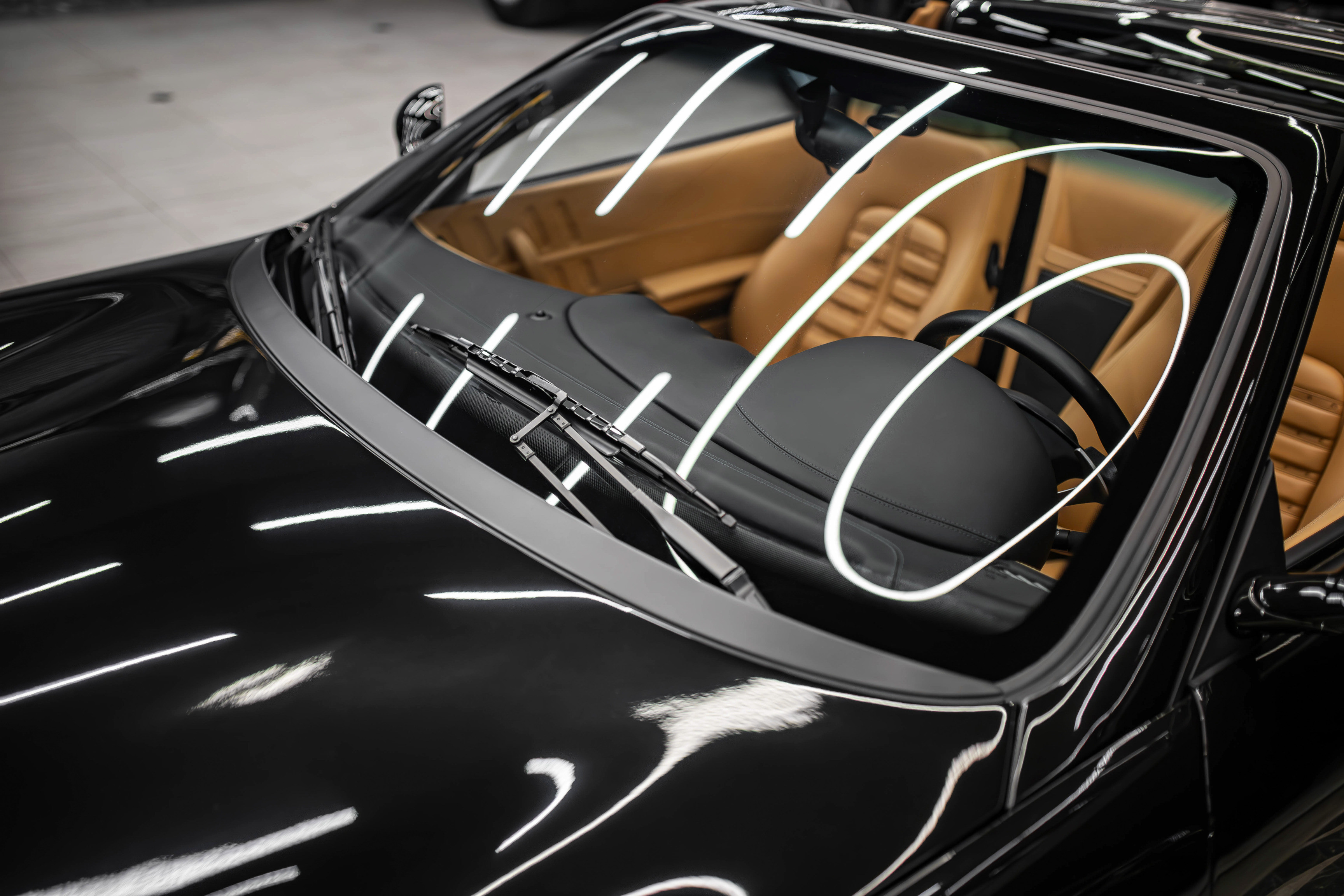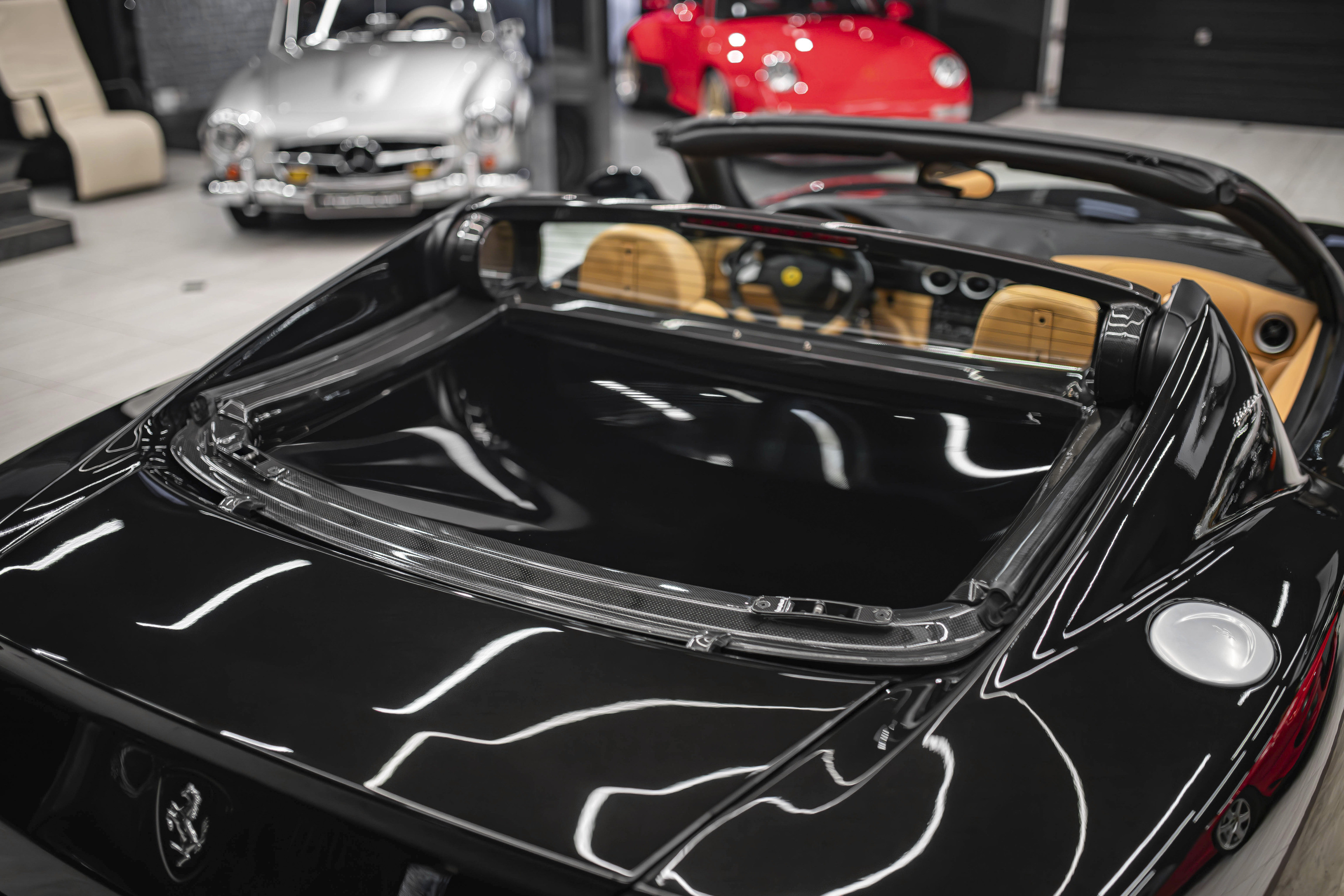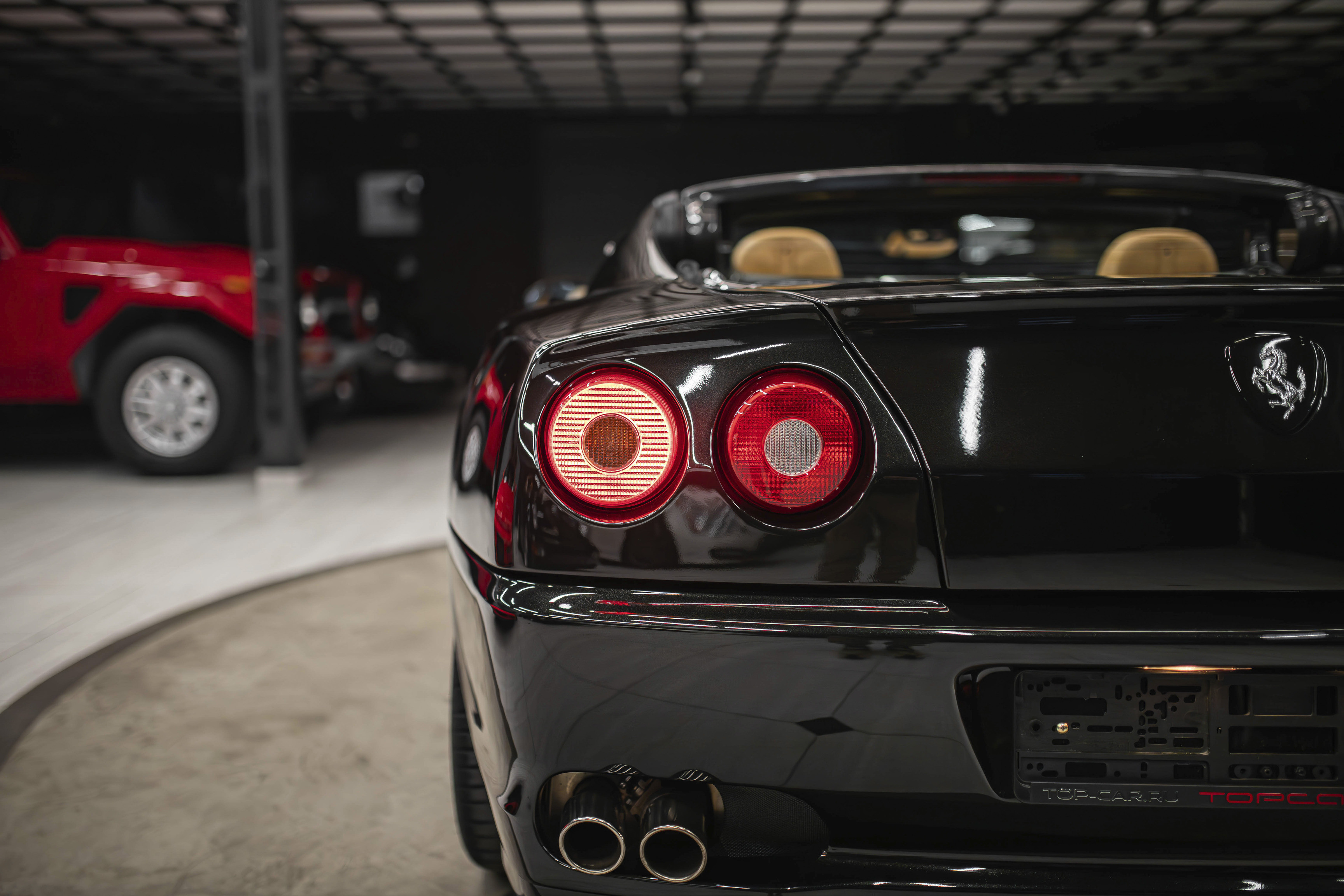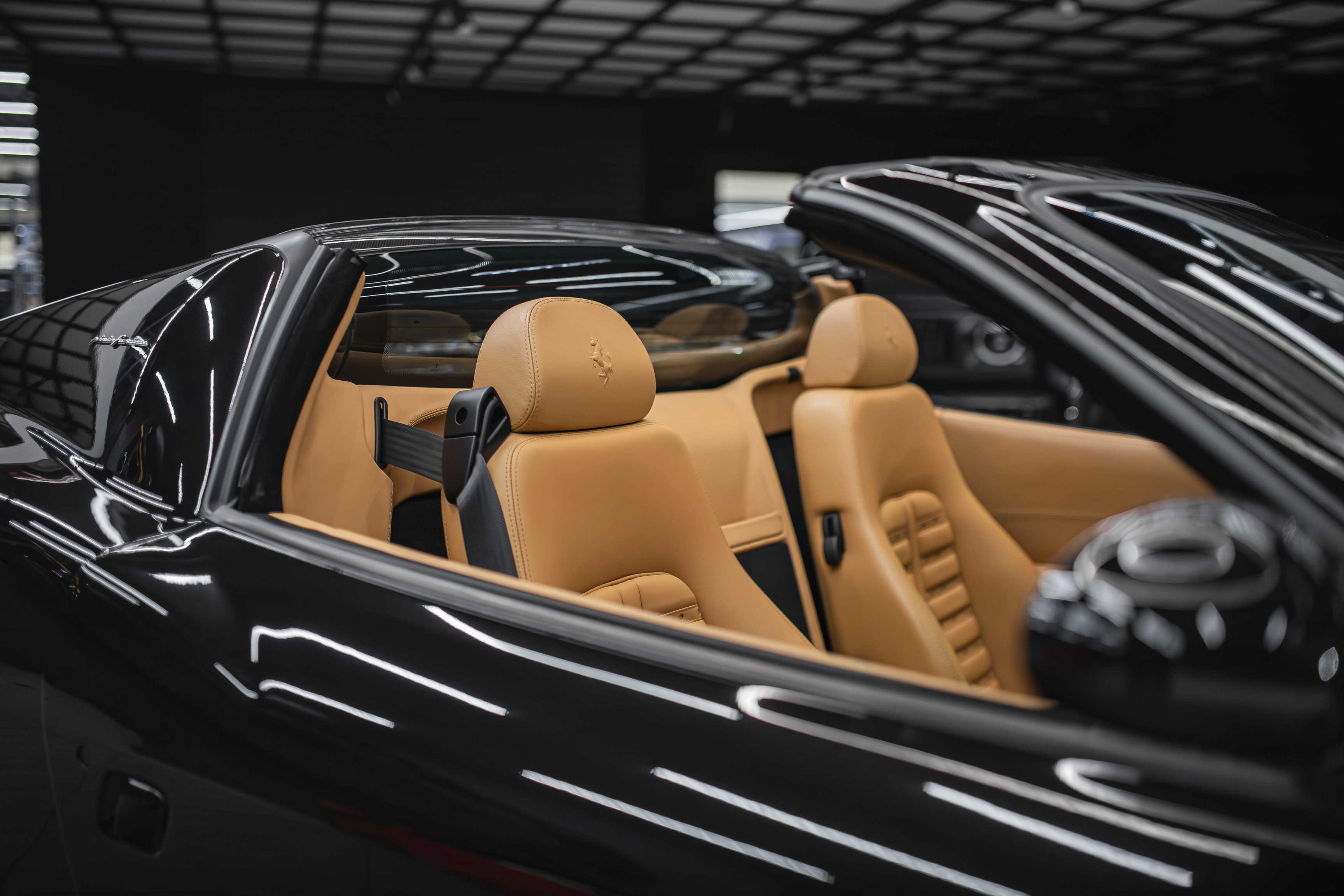 Итак, ключевой особенностью Феррари 575 Суперамерика стала прозрачная стеклянная крыша Г-образной формы, которая с помощью электропривода поворачивается на 180 градусов и ложиться обратной стороной на крышку багажника. А заднее вертикальное окошко, защищающее салон от турбулентных завихрений, затем автоматически возвращается в исходное поднятое положение. Вся процедура занимает 10,0 секунд.